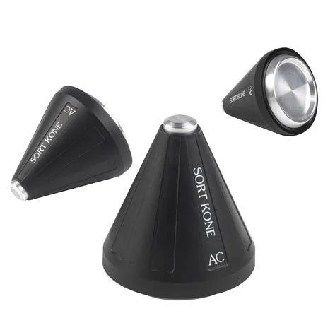 The Nordost AC SORT KONE is a small, black, 56mm in height cone that is topped with a rounded aluminum tip, a black plastic body, and finished with an aluminum base as the Kone’s support structure.