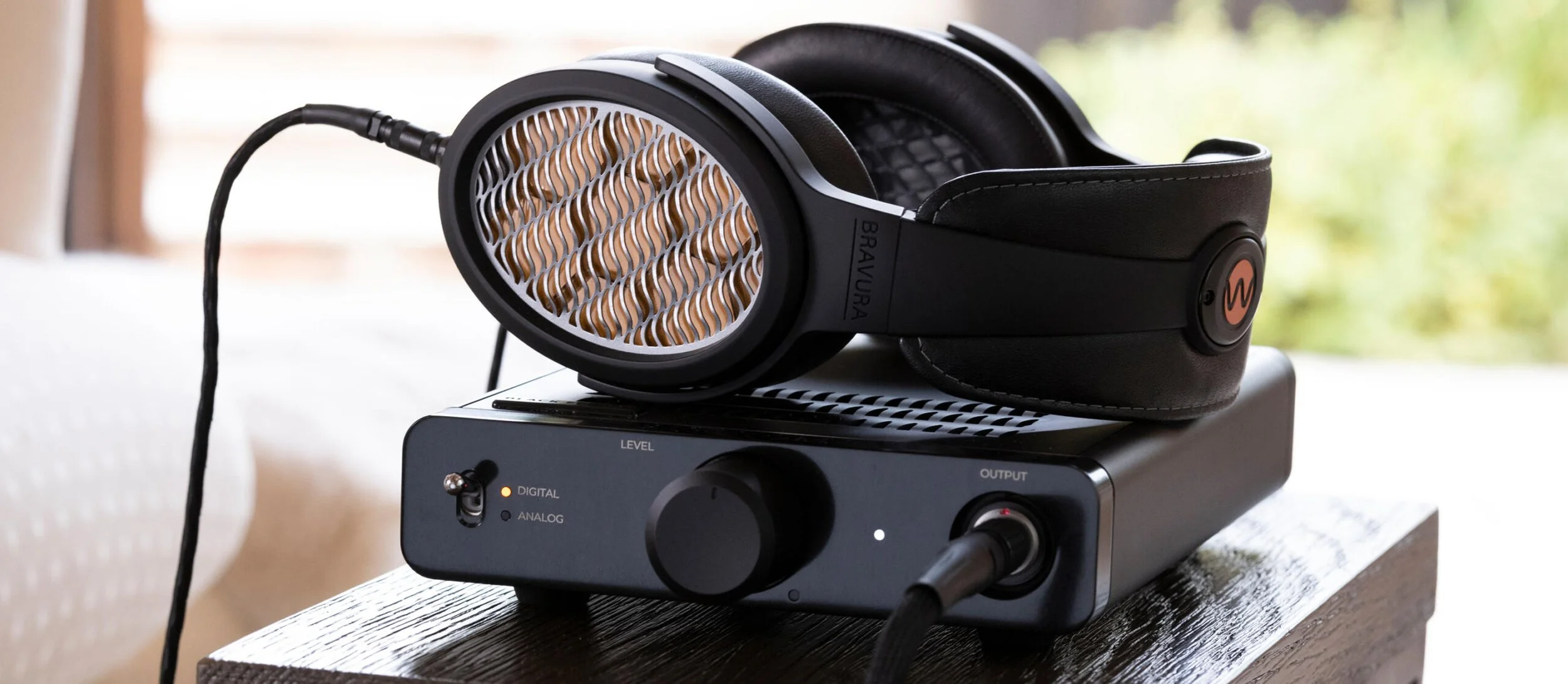 The Bravura headphones come with a cable specifically purposed to engage the Sonoma 1 amplifier. The Sonoma M1 amplifier comes with a power adapter, a USB cable, and instructions.